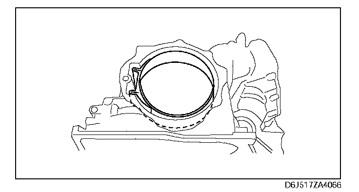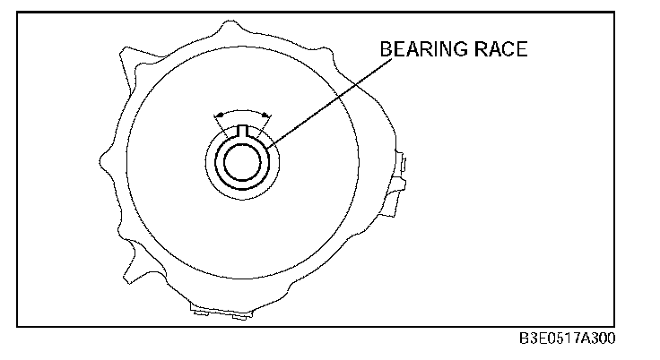 Caution: The bearing race and end cover may be damaged if the end cover is not installed correctly to the transaxle case. Align the projection of the bearing race within the area of the arrows shown in the figure, and then install the end cover to the transaxle case.