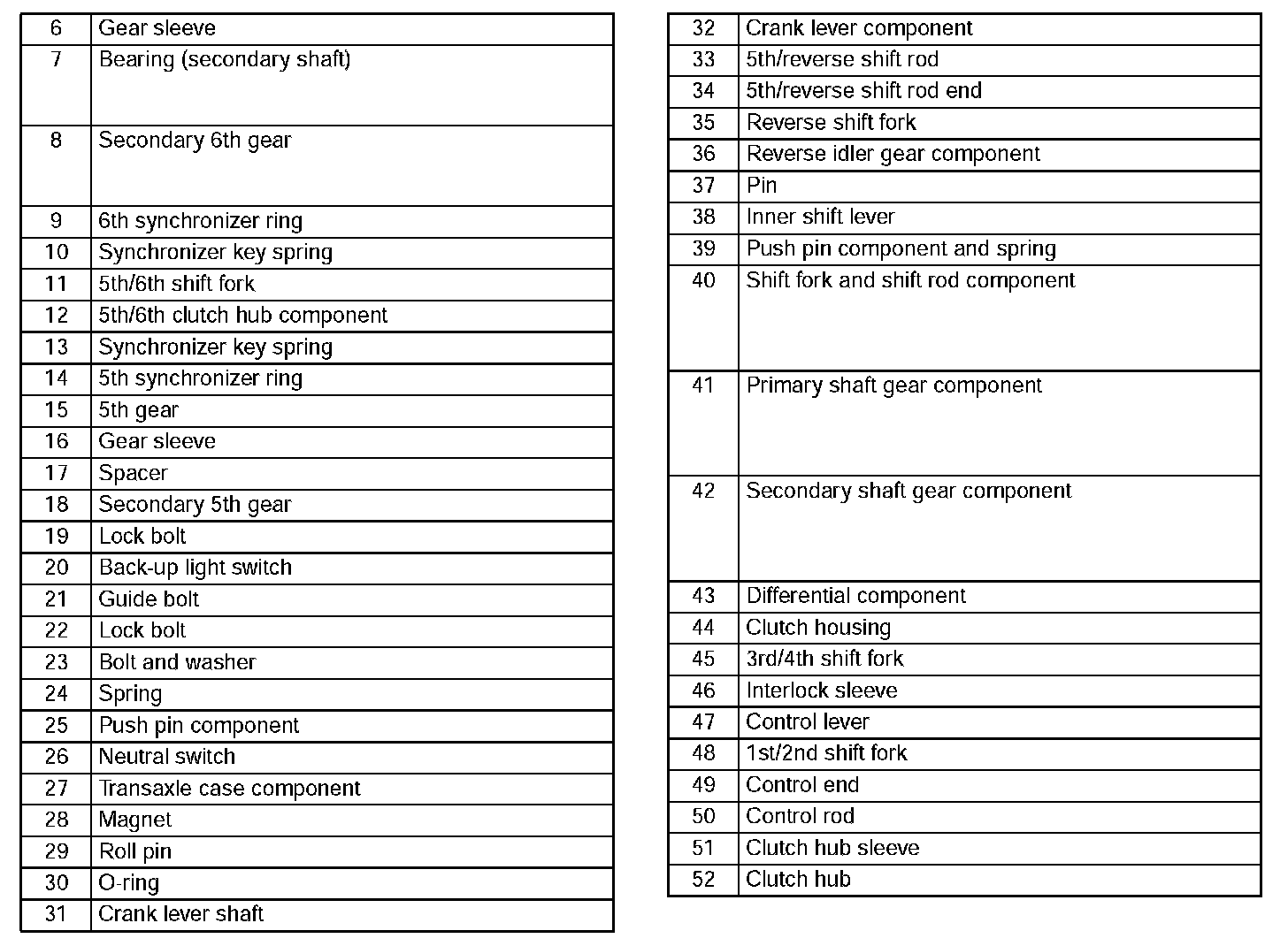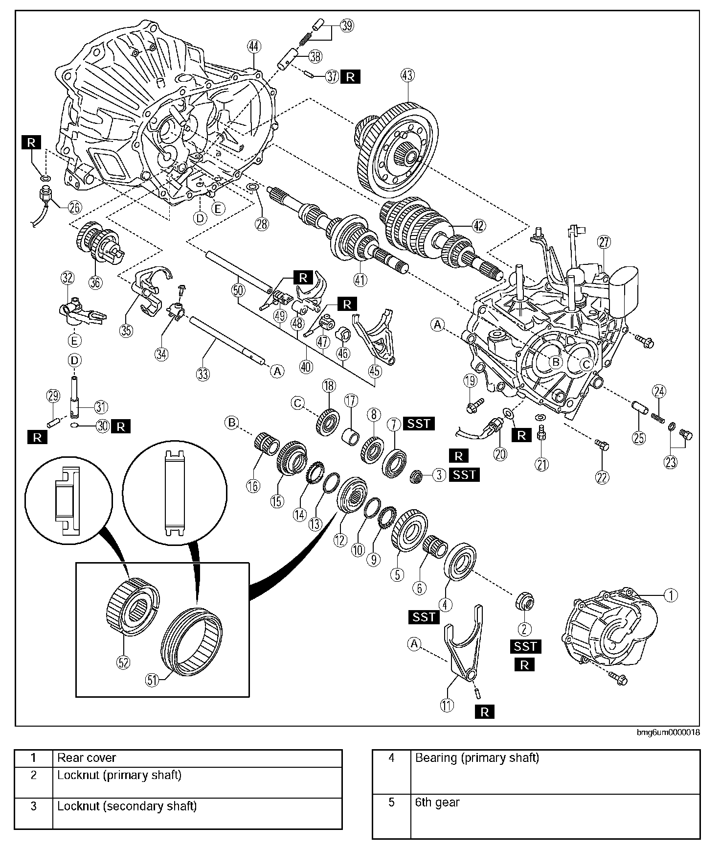 5TH/6TH GEAR AND HOUSING PARTS DISASSEMBLY1. Disassemble in the order indicated in the table.