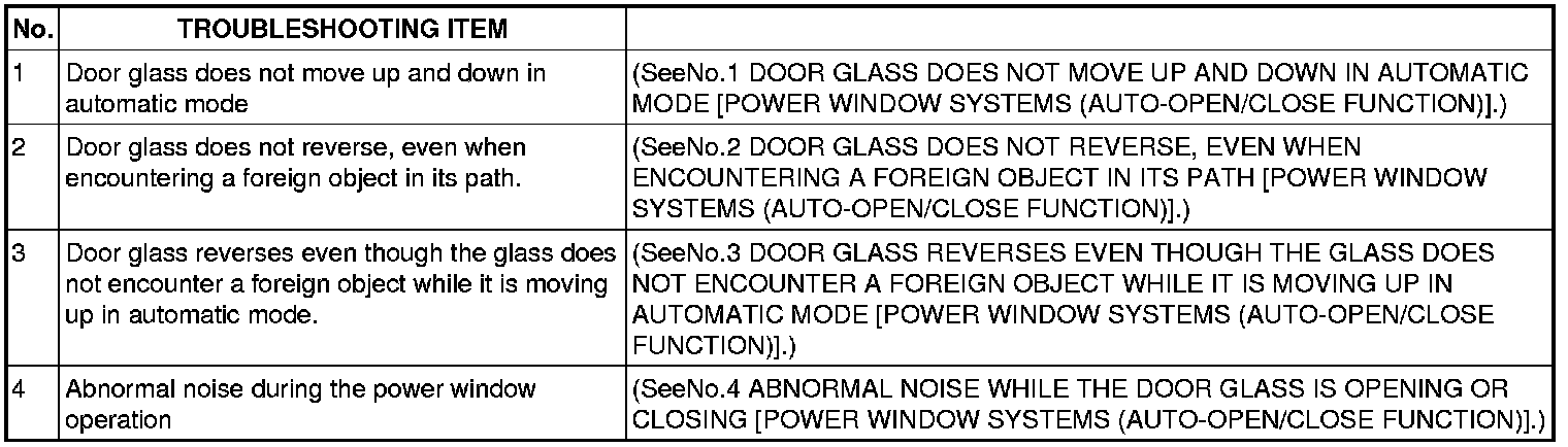 SYMPTOM TROUBLESHOOTING CHART [POWER WINDOW SYSTEMS (AUTO-OPEN/CLOSE FUNCTION)]