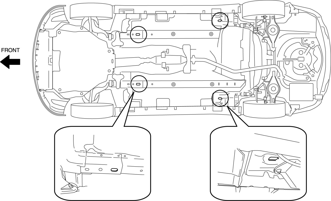 - When transporting the vehicle by flat bed tow truck or trailer, secure the vehicle to the trailer using the holes and left tiedown loop shown in the figure.