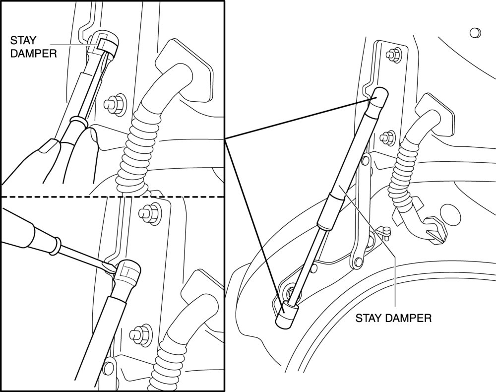- Removing the stay damper without supporting the trunk lid can be dangerous. The trunk lid may fall and injure you. Open the trunk lid fully and support it before removing the stay damper.