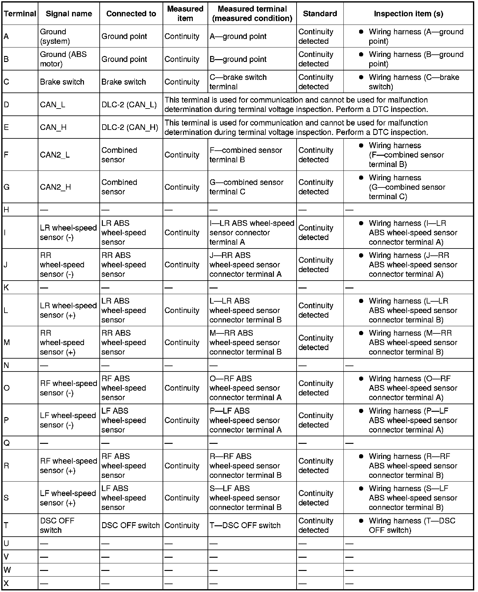 3. Attach the tester lead to the DSC HU/CM wiring harness-side connector, then inspect the voltage, continuity, or resistance according to the standard (reference) on the table.