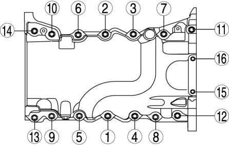 Install the oil pan and the bolts to the cylinder block.Tighten the bolts in the order shown in the figure.