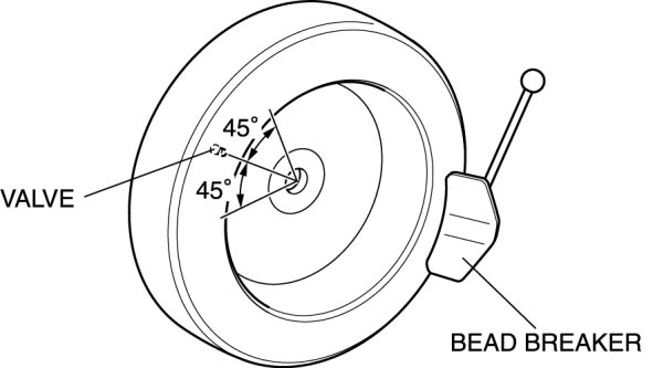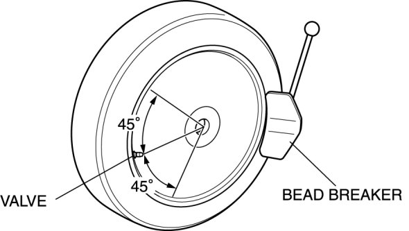 - Do not break the bead loose within the range of 45° on each side of the valve. Otherwise, the wheel unit could be damaged.