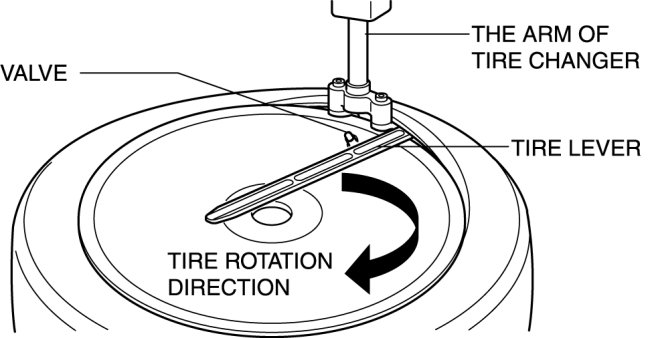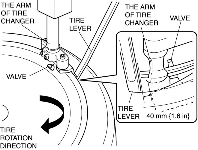 4. Insert the tire lever at the point 40 mm {1.6 in} from the wheel unit in the direction that the tire changer turntable rotates.