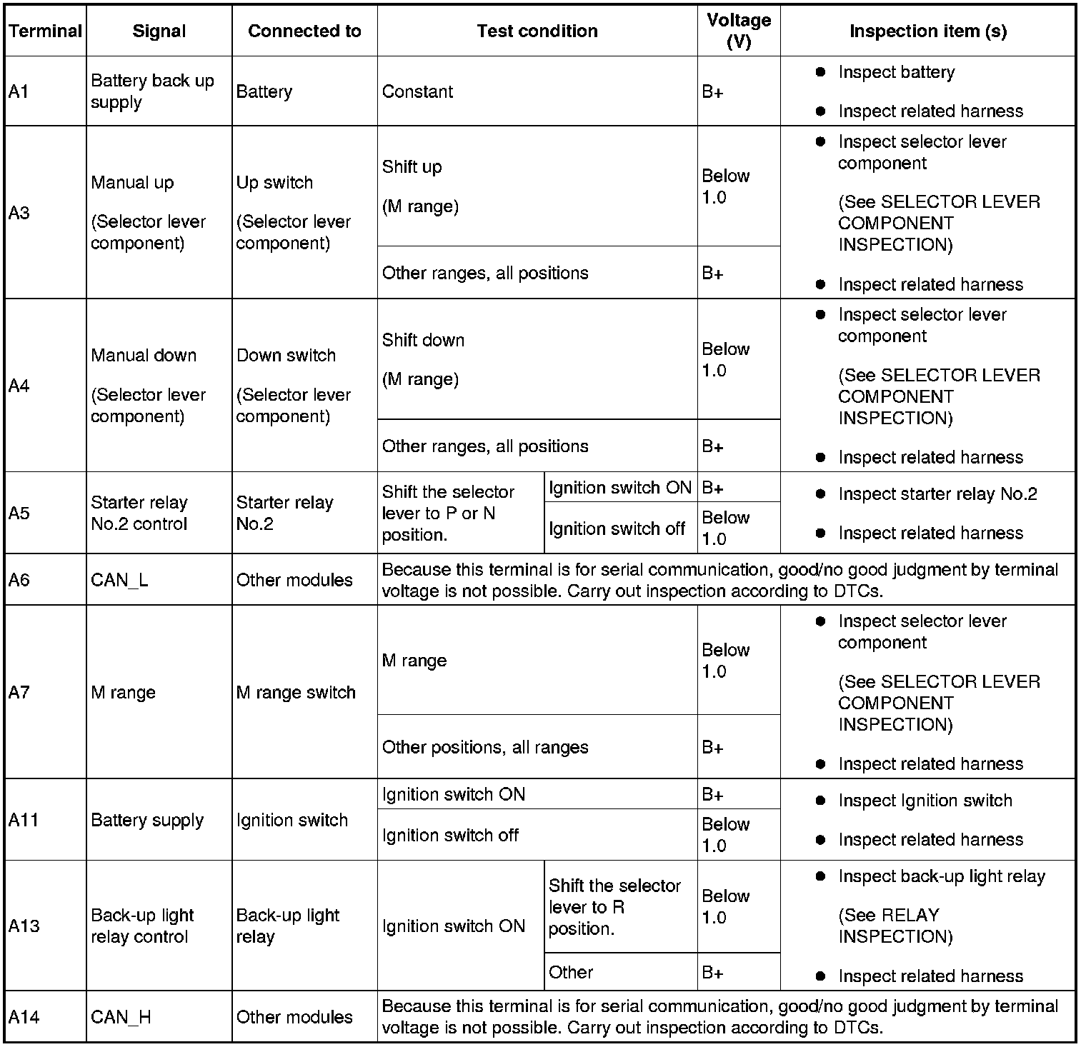 - If the voltage is not as specified in the Terminal Voltage Table (Reference), inspect the parts under "Inspection item (s)".