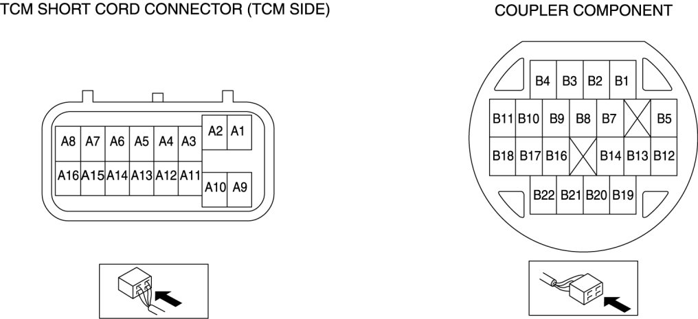 - Use the ground of terminal A9 of the TCM connector (wiring harness-side) when measuring terminal voltage, as an error may occur when connecting the negative circuit tester to ground.
