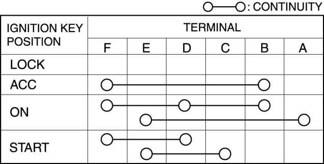 4. Verify that the continuity between the ignition switch terminals is as indicated in the table.
