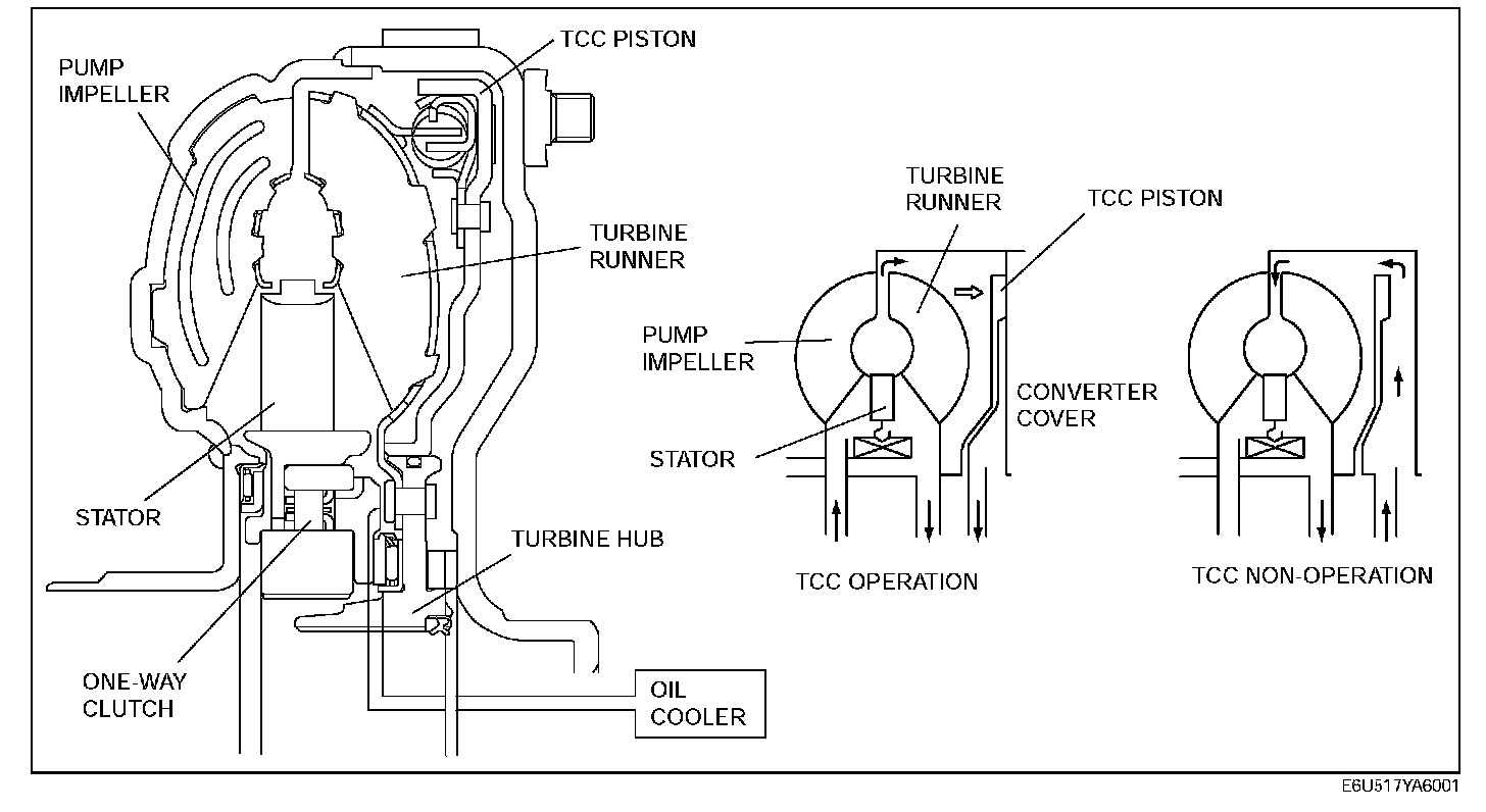 TORQUE CONVERTER STRUCTURE^ The torque converter with the TCC control consists of the turbine runner, pump impeller, stator, and the TCC piston as shown in the figure. The TCC piston engages with the turbine runner and slides on the turbine hub to be pushed and contacts with the torque converter cover during the TCC control operation. In the TCC piston, a spring for torsion damper is installed to absorb the engine torque fluctuation during TCC control.