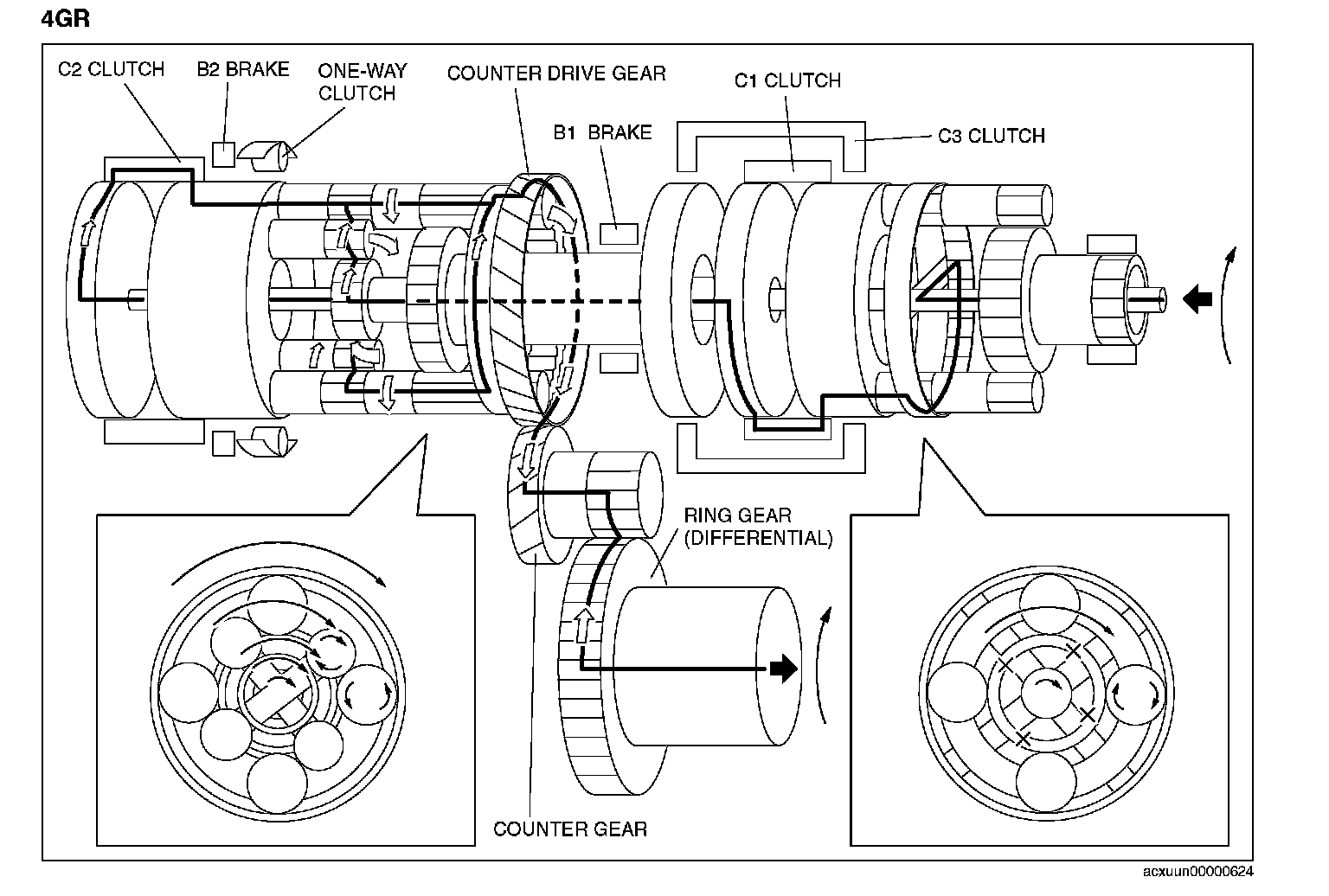 12. Counter drive gear (rotates clockwise) [because the rear planetary ring gear is installed on the counter drive gear, the rotational direction and the revolution is the same as the rear planetary ring gear]