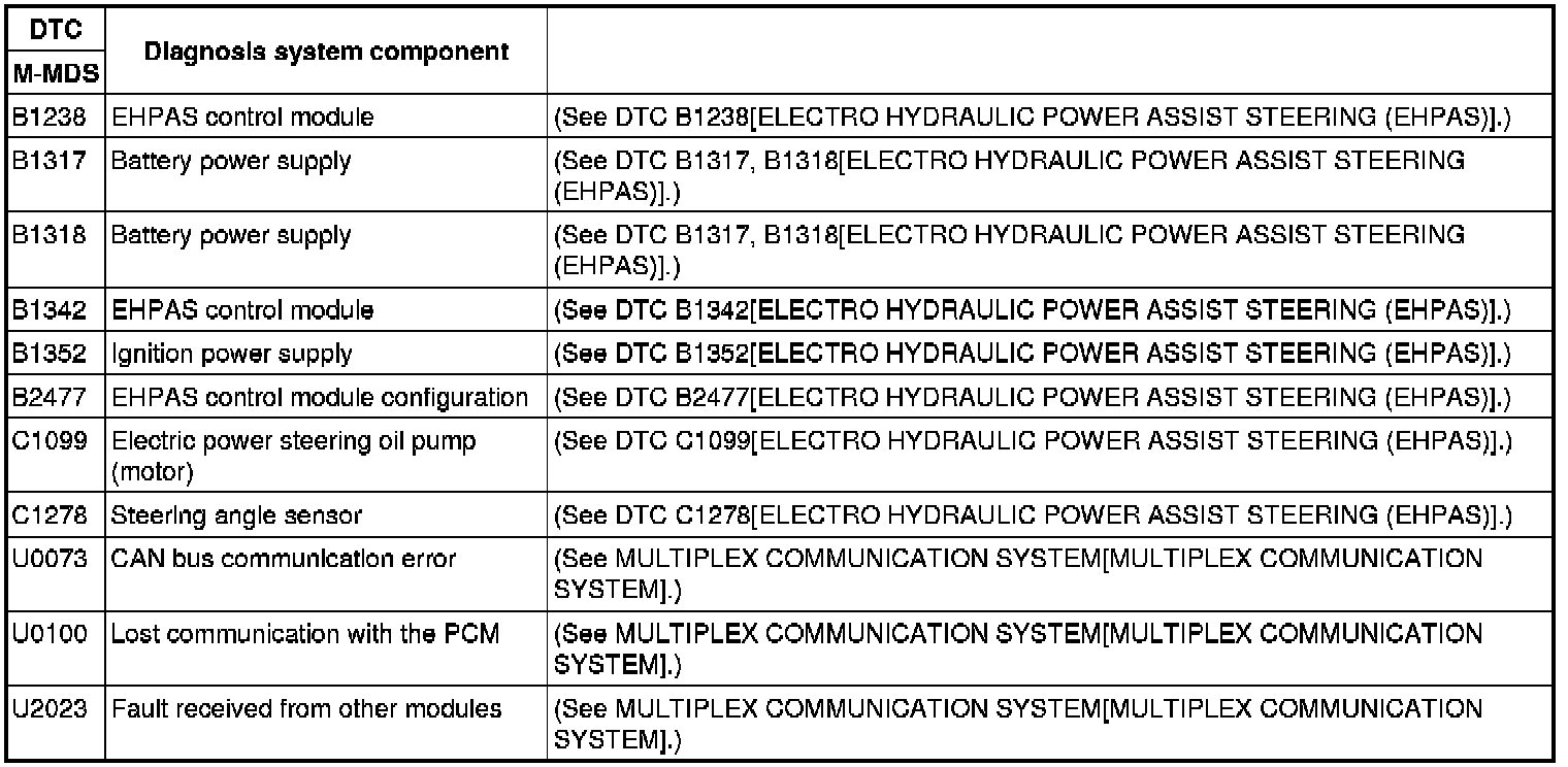 DTC Table Electro Hydraulic Power Assist Steering (EHPAS)