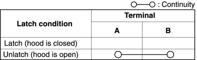 2. Inspect for continuity between the hood latch switch terminals.