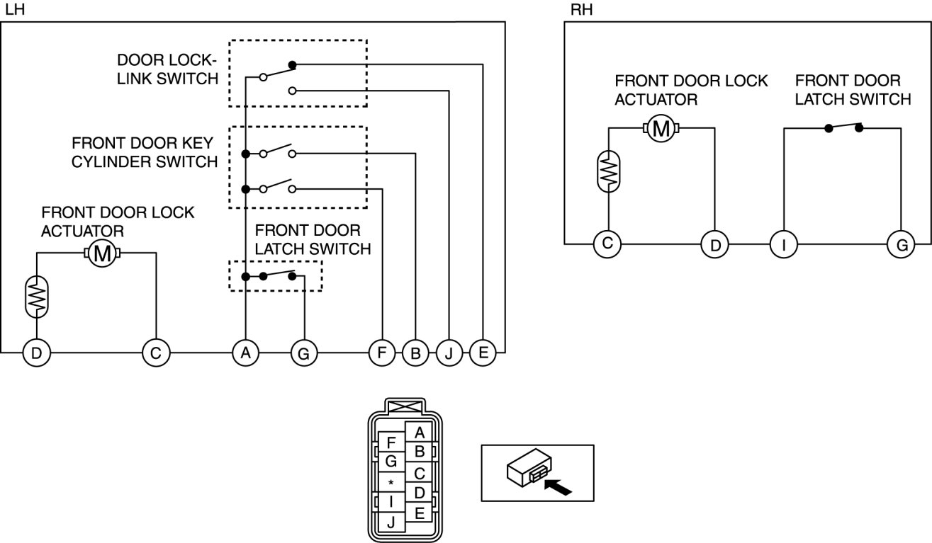 1. The following actuators and switches are integrated with the front door latch and lock actuator. Inspect the front door latch and lock actuator according to each inspection procedure for the following items.