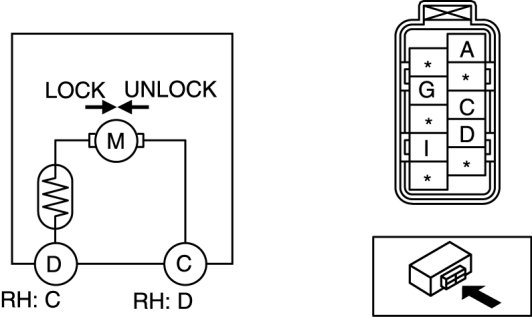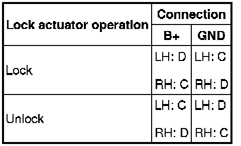 1. Apply battery positive voltage and connect ground to the corresponding rear door lock actuator terminals, and inspect the rear door lock actuator operation.