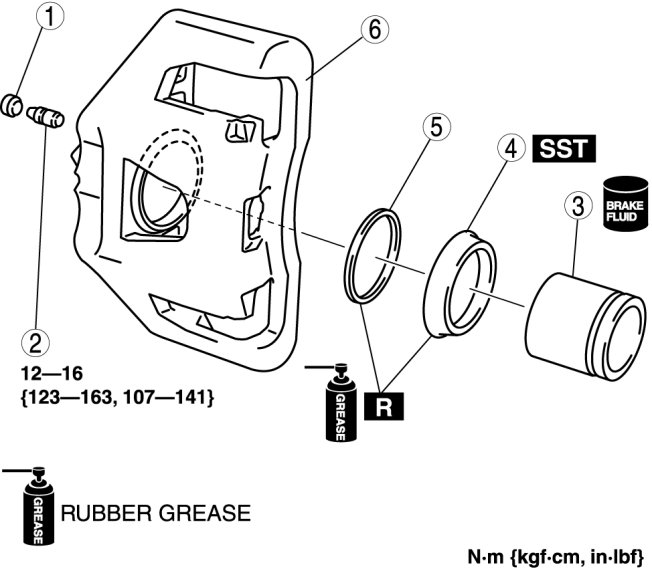- When blowing compressed air into the caliper body, the piston may pop out and cause injury if not supported at the correct point. Securely support the piston friction surface by hand when blowing compressed air.