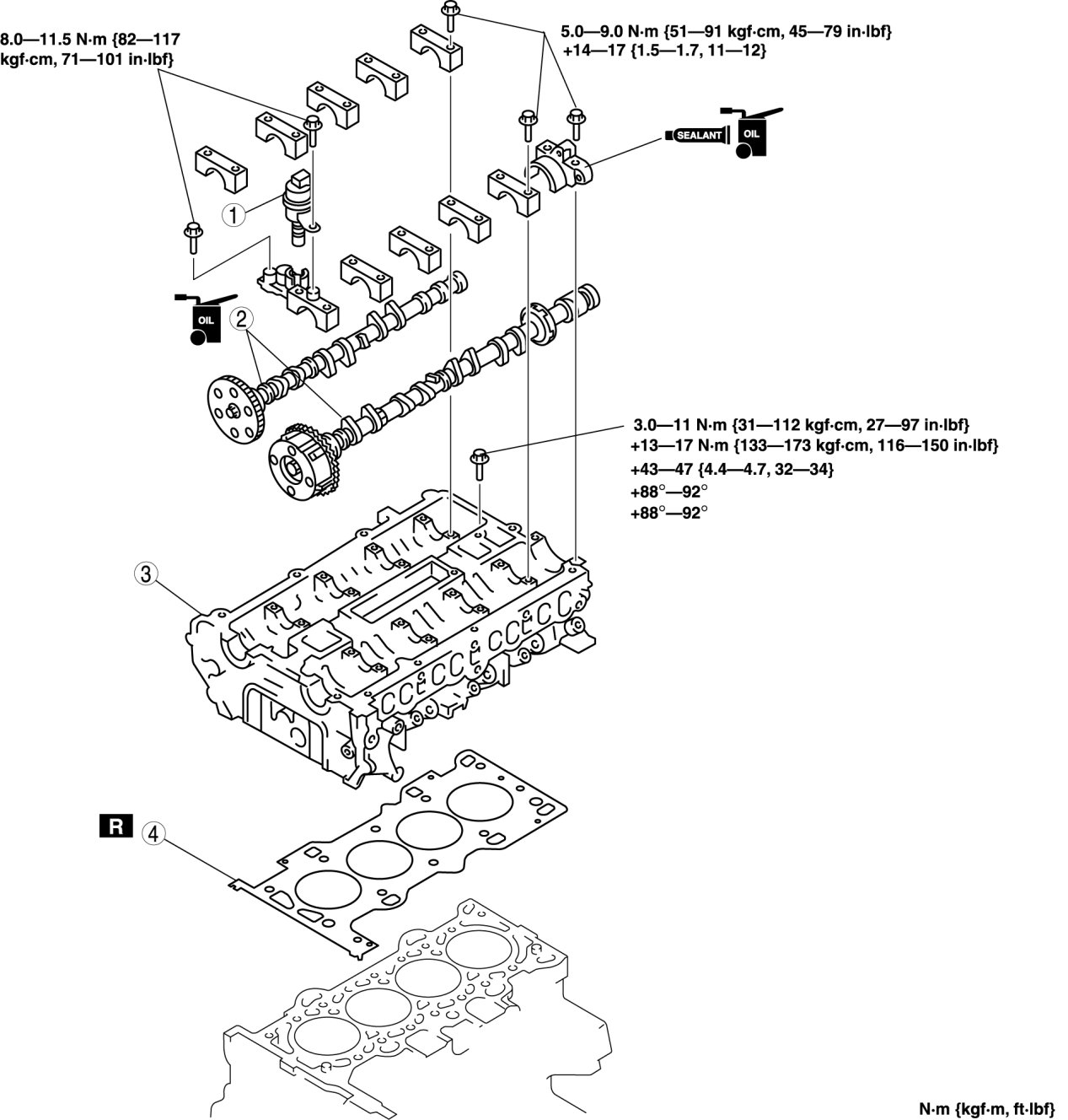 - 3rd step: 43-47 Nm {4.4-4.7 kgf-m, 32-34 ft-lbf}