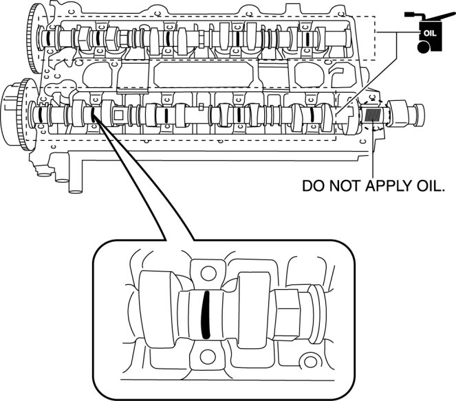 1. Apply the gear oil (SAE No. 90 or equivalent) to each journal of the cylinder head as shown in the figure.