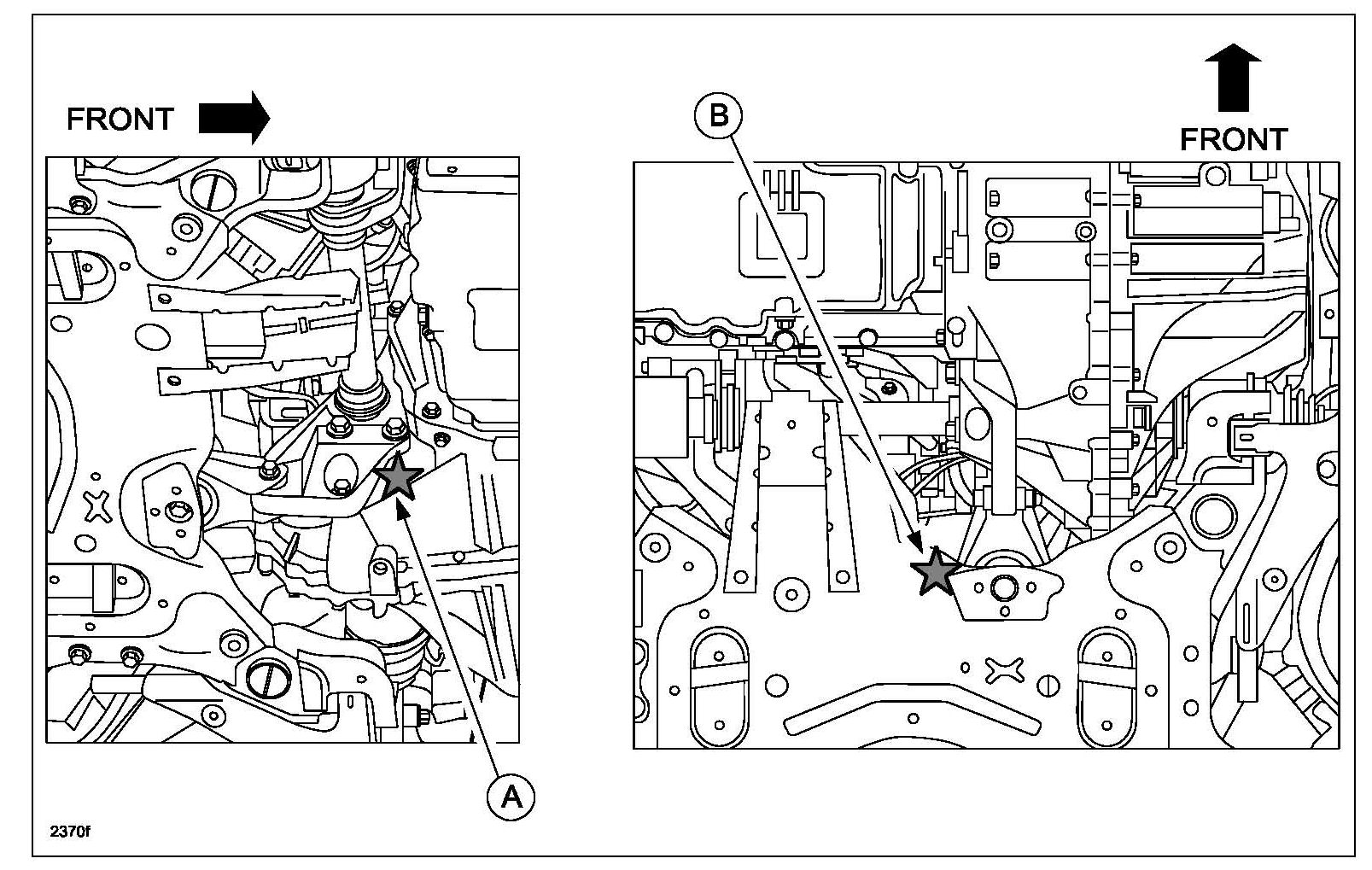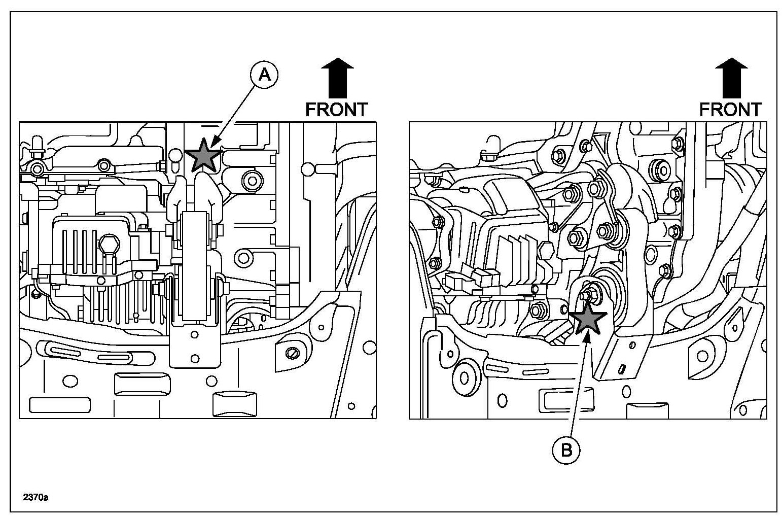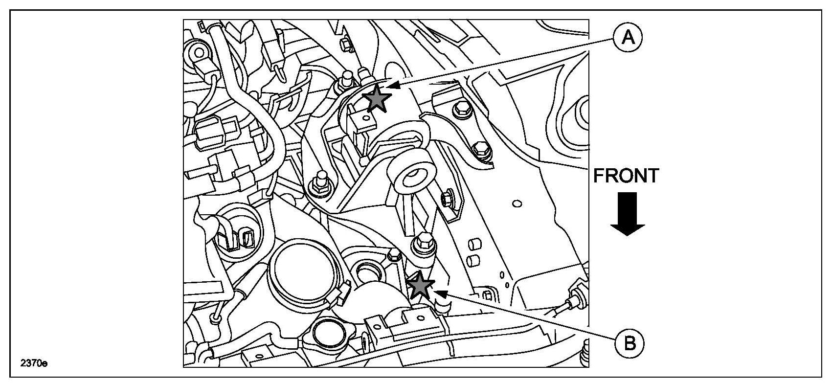 Engine Side: Transmission near bolt (A). Body Side: Bracket near bolt (B).