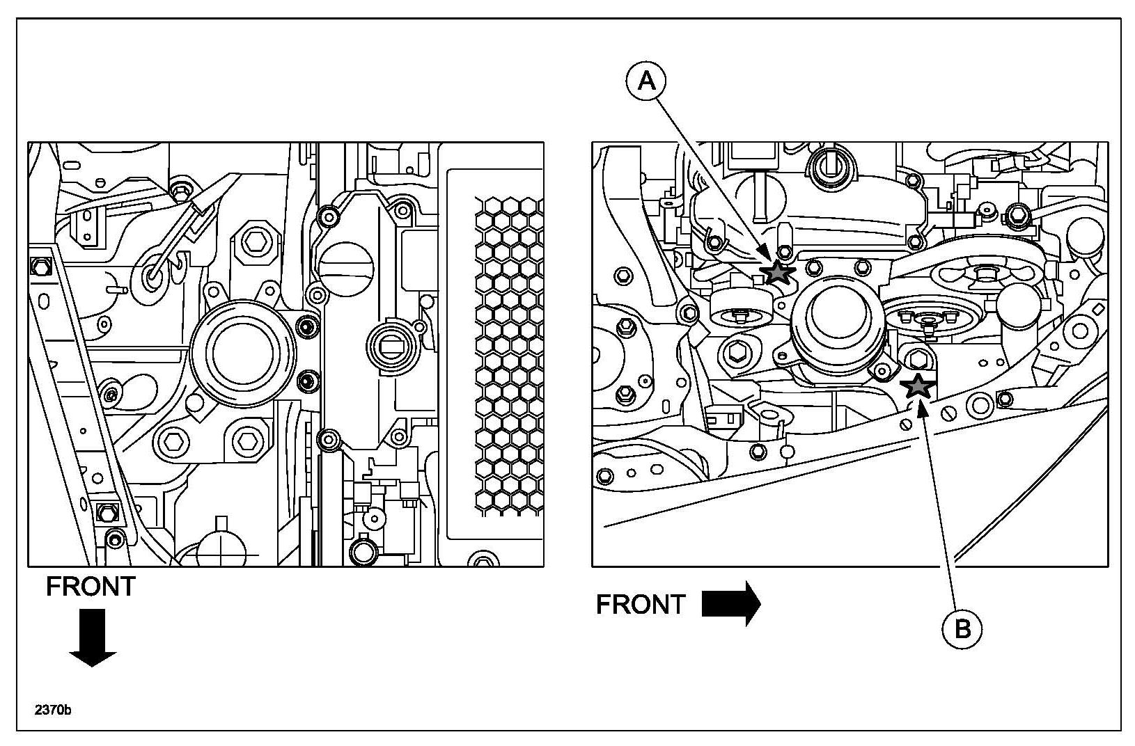 Engine Side: Front cover head bolt (A). Body Side: Between the bolts (B).
