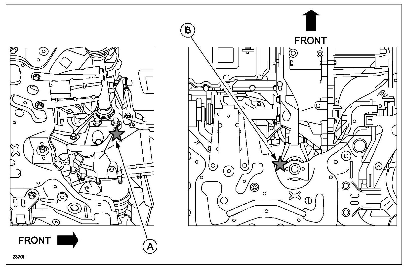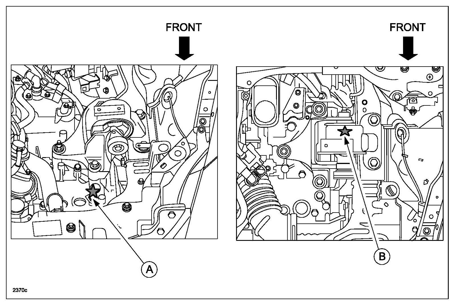 Body Side: Front of case (A). Engine Side: Transmission near bolt (B).