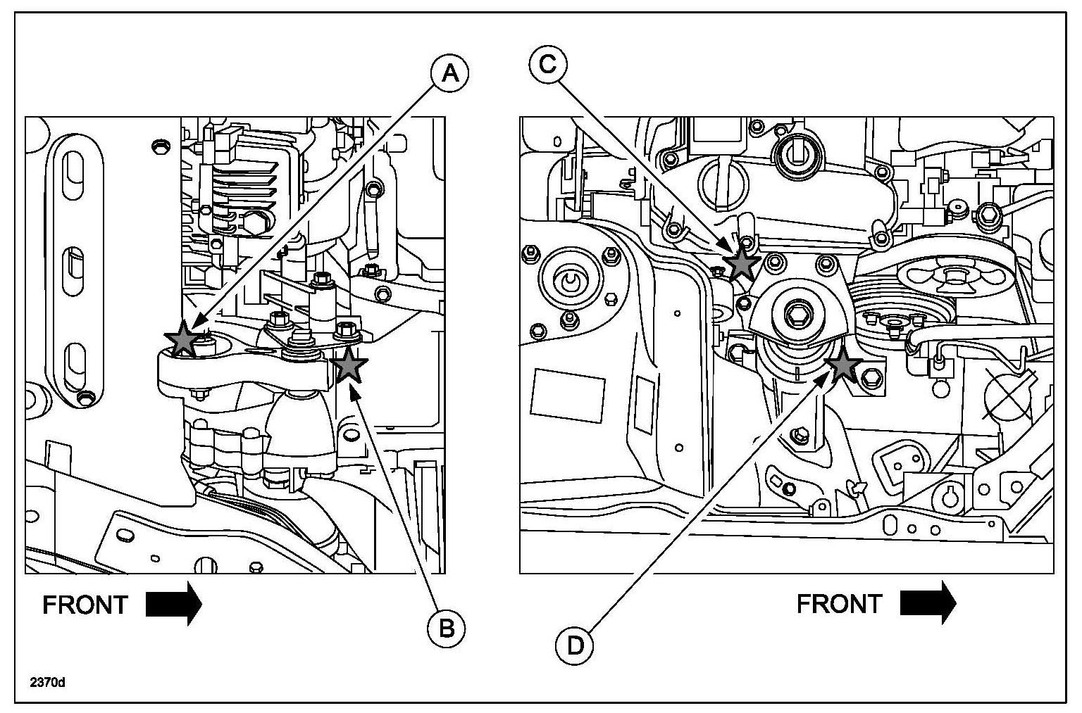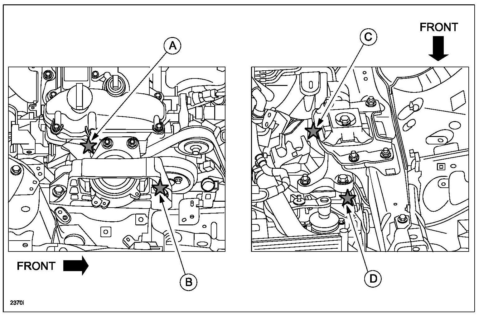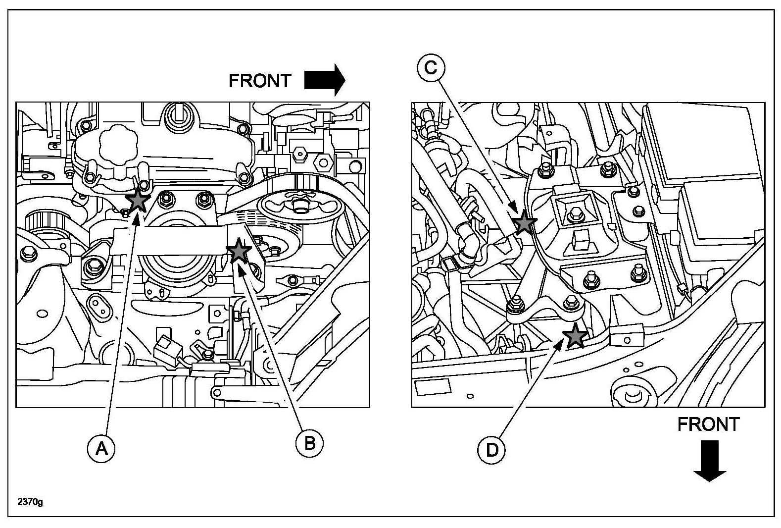 Body Side: Right edge of plate (C). Engine Side: Transmission near bolt (D).