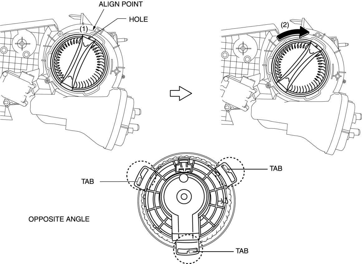 1. Align the SST hole with the align point (1) and rotate the SST (2) and then confirm that the SST tabs into the three set holes on the blower motor they are inserted as shown in the figure.