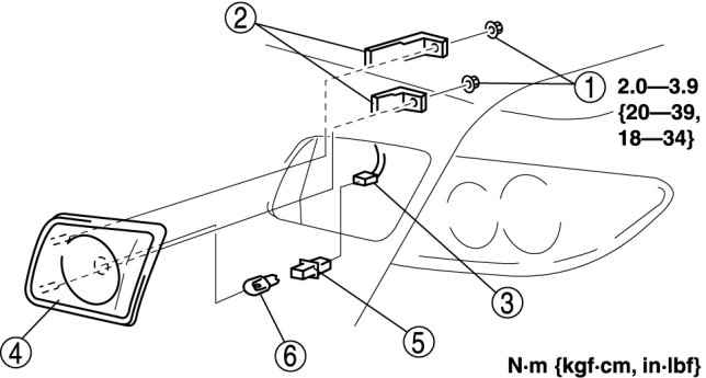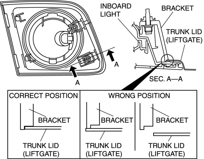 1. Insert the inboard light into the trunk lid (liftgate) as shown in the figure, then pivot it inward and fix in place.