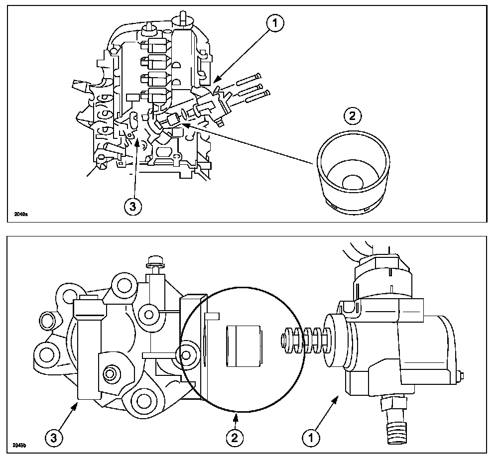 When replacing the high-pressure fuel pump (1) or transferring the high-pressure fuel pump during an engine replacement, it is very important to make sure the tension collar (2) is installed before reinstalling the fuel pump. The tension collar (L3K9-12-615) can either come off together with the fuel pump or remain in the housing (3) on the engine. Failure to install the tension collar will result in excessive engine noise and the subsequent failure of the high-pressure fuel pump and the camshaft cam lobe the tension collar rides on.