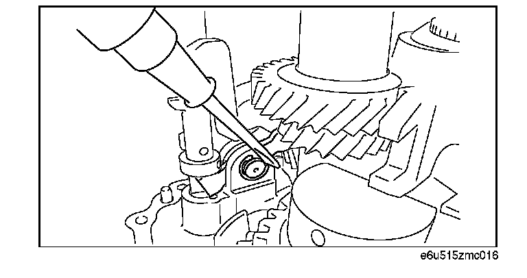 37. Pry and remove the roller guide for the secondary shaft (No.1) front bearing using a flathead screwdriver as shown in the figure.