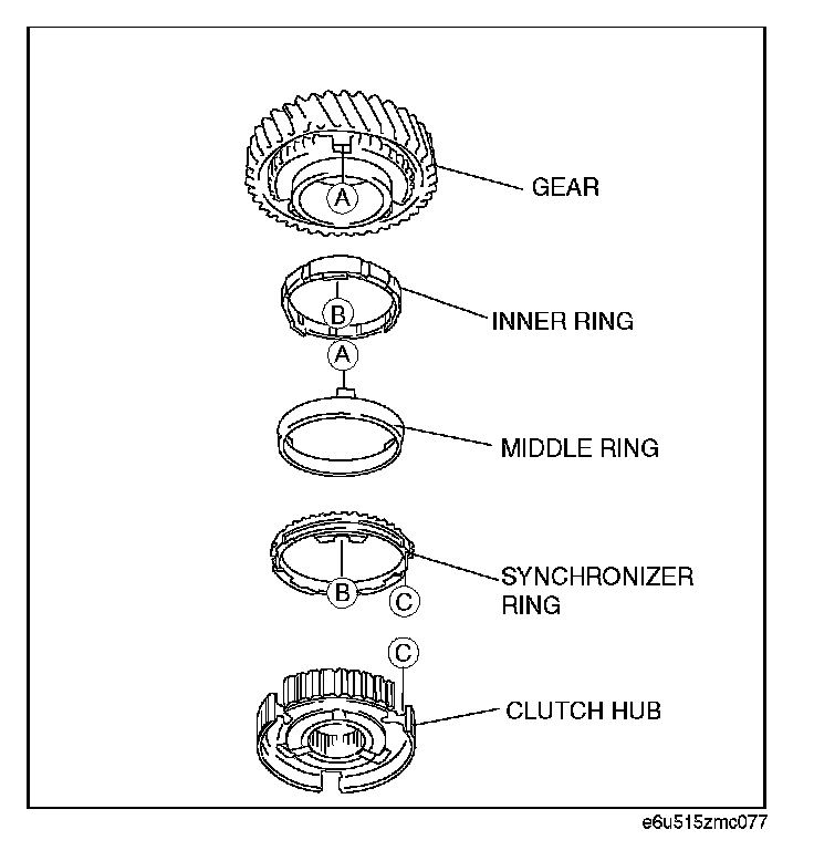 2nd Synchronizer Ring and 2nd Gear Assembly Note1. Place the 2nd synchronizer ring, 2nd middle ring, 2nd inner ring and 2nd gear.