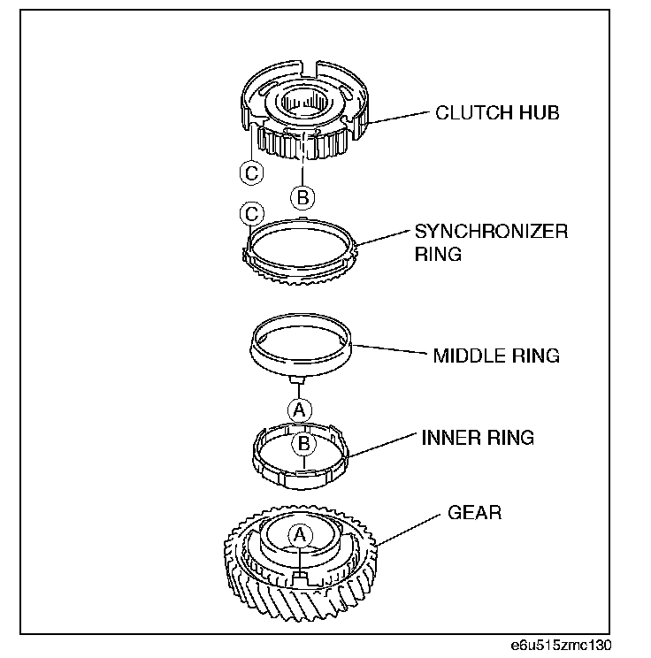 4th Gear, 4th Synchronizer Ring and 3rd/4th Clutch Hub Component Assembly Note1. Place the 4th gear, 4th inner ring, 4th middle ring, 4th synchronizer ring and 3rd/4th clutch hub.