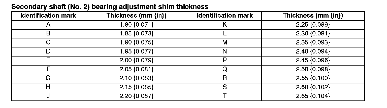 Secondary shaft (No. 2) bearing adjustment shim thickness