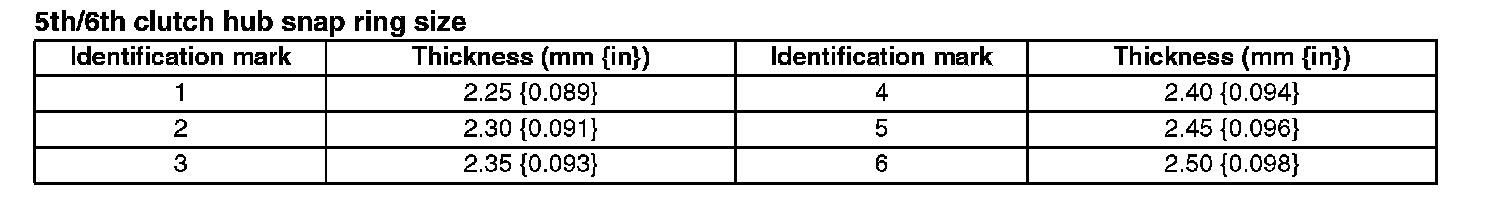 Clearance between 5th/6th clutch hub and snap ring: 0.0 - 0.1 mm (0.0000 - 0.0039 in)