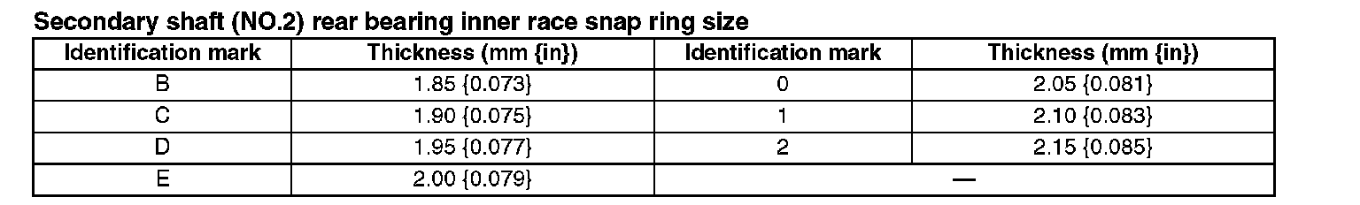 Clearance between secondary shaft (NO.2) rear bearing inner race and snap ring: 0.0 - 0.1 mm (0.0000 - 0.0039 in)