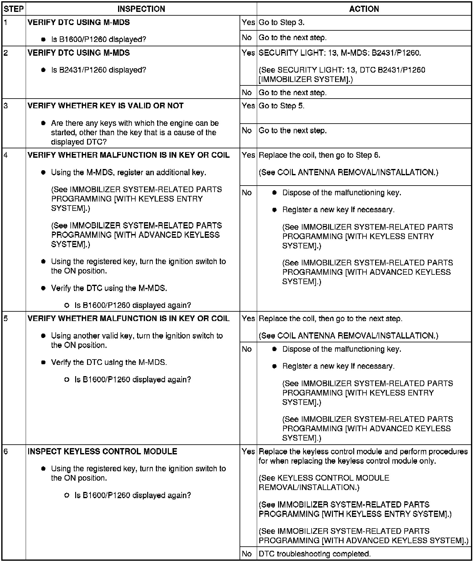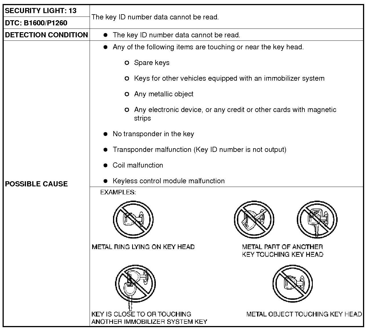 SECURITY LIGHT: 13, DTC B1600/P1260 [IMMOBILIZER SYSTEM]