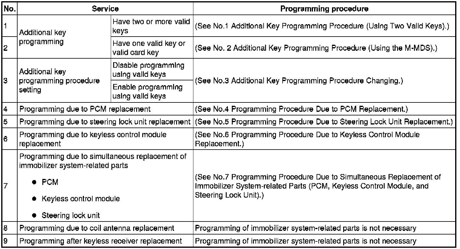 Immobilizer System-Related Parts Service and Programming Procedure Table