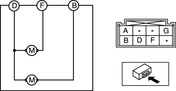 1. Apply battery positive voltage and connect the ground to the corresponding power outer mirror terminals, and then inspect the operation of the power outer mirror.