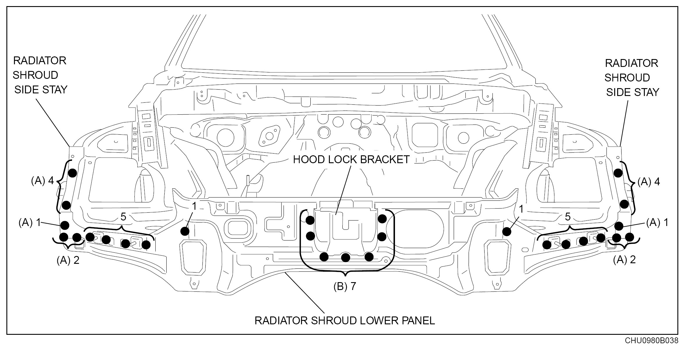 NOTE: When removing the radiator shroud side stay and the hood lock bracket separately, drill the 14 weld locations indicated by (A) and the seven weld locations indicated by (B).