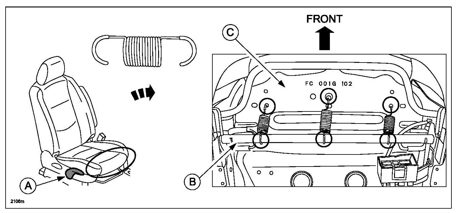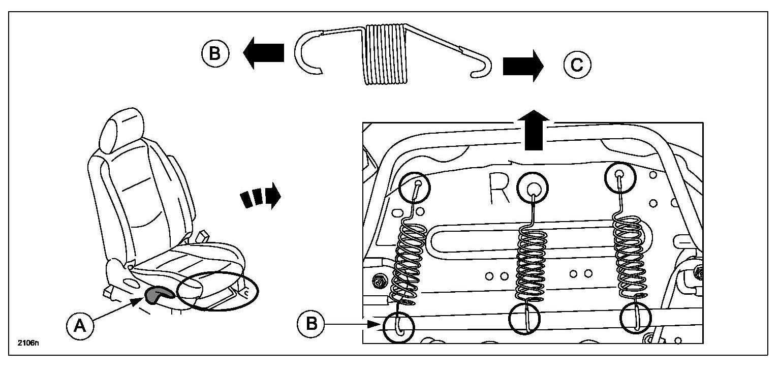 2. Install three (3) springs to the back of the seat cushion seat pan (C) and pipe frame (B).