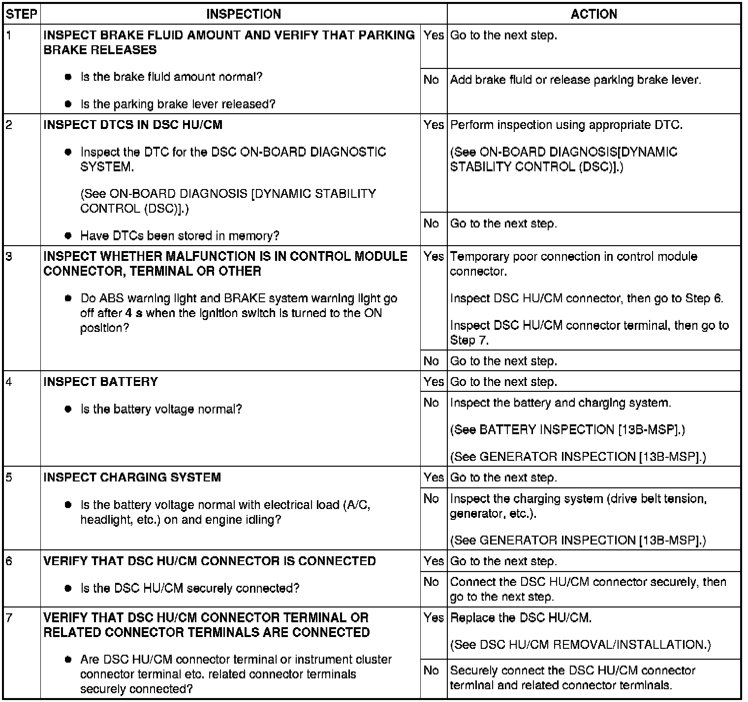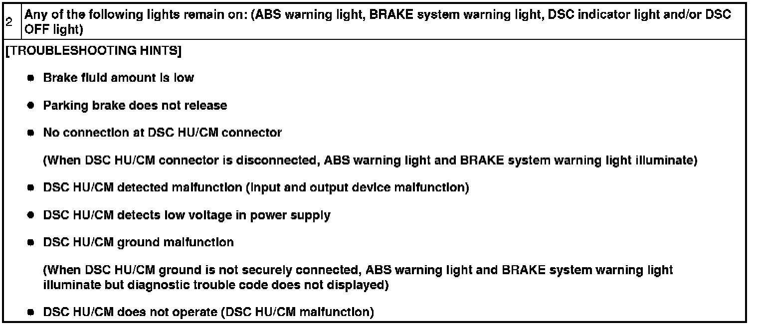 No.2 Any Of The Following Lights Remain On: (ABS Warning Light, Brake Warning Light, DSC Indicator Light And/Or DSC Off Light)