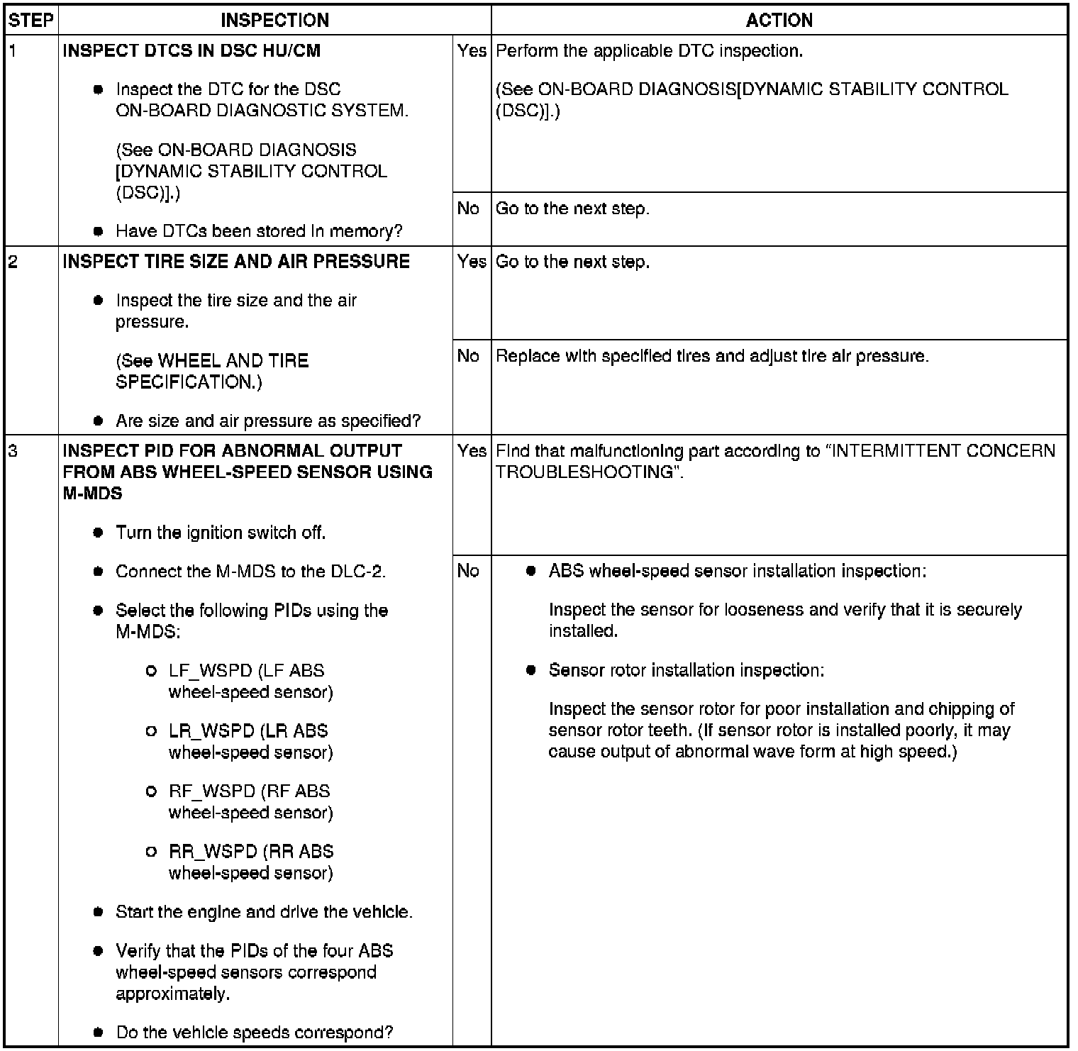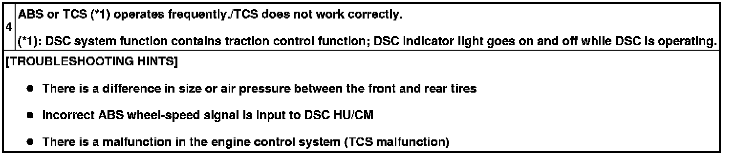 NO.4 ABS OR TCS*1 OPERATES FREQUENTLY/TCS DOES NOT WORK CORRECTLY *1: DSC SYSTEM FUNCTION CONTAINS TRACTION CONTROL FUNCTION, DSC INDICATOR LIGHT GOES ON AND OFF WHILE DSC IS OPERATING [DYNAMIC STABILITY CONTROL (DSC)]