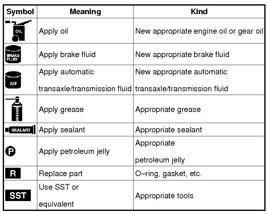 - There are eight symbols indicating oil, grease, fluids, sealant, and the use of SST or equivalent. use. These symbols show application points or use of these materials during service.