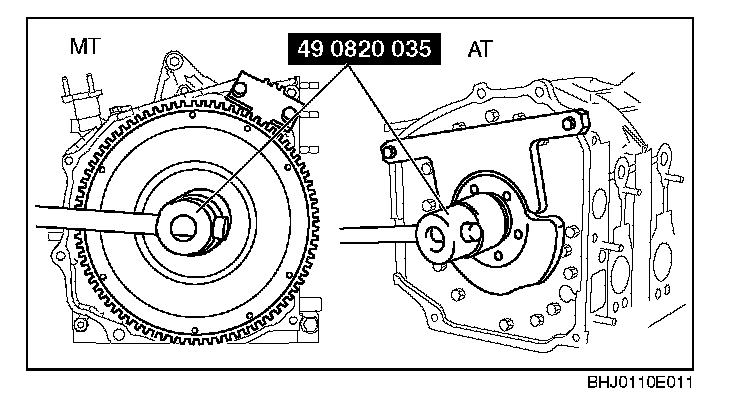 3. Remove the flywheel (MT) or counterweight (AT), using the SST.