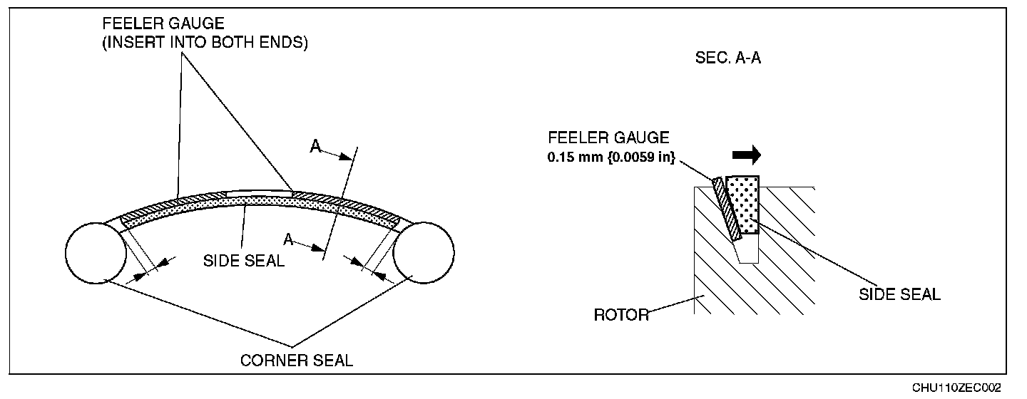 3) Measure the clearance between both ends of the side seal and the corner seal using a feeler gauge.