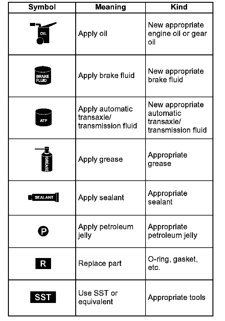 There are eight symbols indicating oil, grease, fluids, sealant, and the use of SST or equivalent. These symbols show application points or use of these materials during service.
