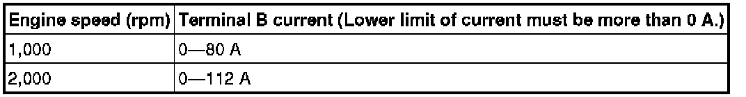 Generator generated current (reference value) [Conditions] Ambient temperature: 20 °C {68 °F}, Voltage: 13-15 V, Engine hot