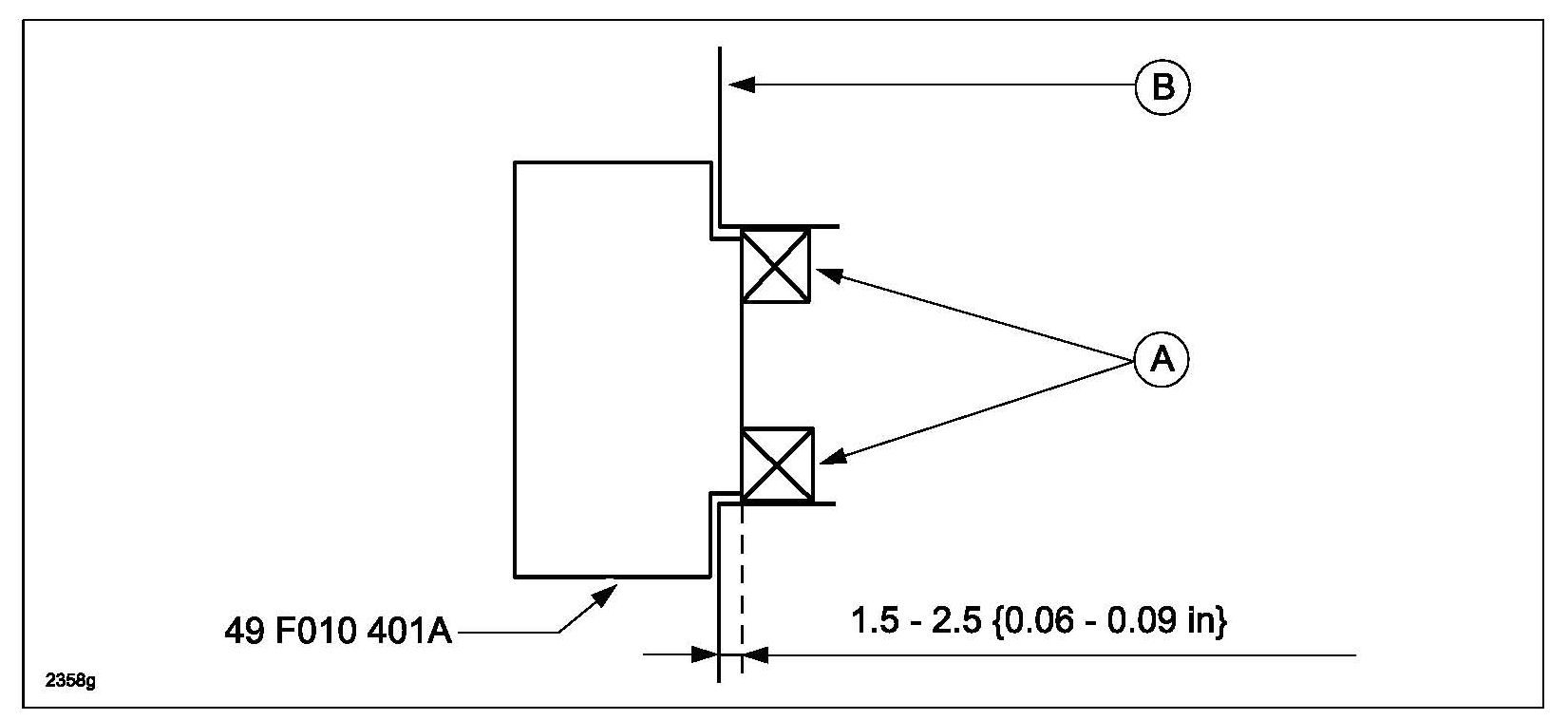 Pressing distance for the front oil seal (A) from edge of front cover (B): 1.5-2.5 mm {0.06-0.09 in}.