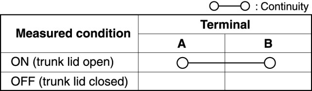 3. Verify that the continuity between the trunk compartment light switch terminals is as indicated in the table.