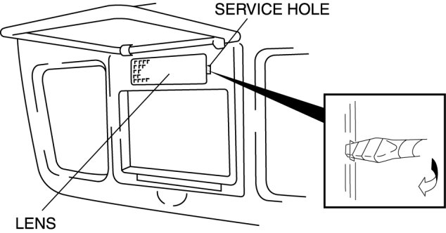 2. Insert a tape-wrapped flathead screwdriver into the service hole and pry with the screwdriver in the direction shown by the arrow to remove the lens.