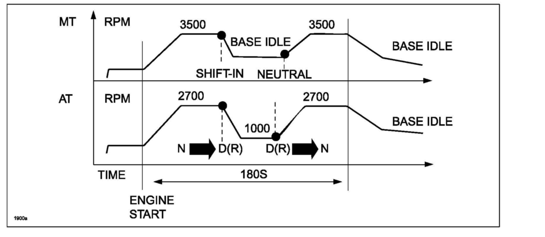 If the vehicle is shifted into Drive or Reverse (AT) or any gear but neutral (MT) during the 180 second fast idle duration the engine RPM will drop to 1000 RPM (AT) or base idle (MT) to prevent sudden movement due to the high idle speed condition as outlined in the graph.